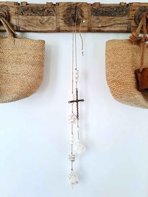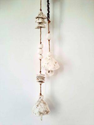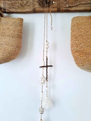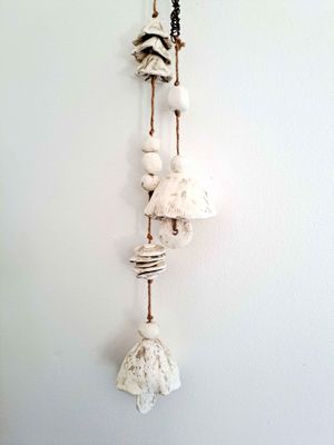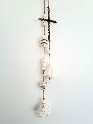 Handcrafted wall hanging in light tonal colours. A natural piece to hang indoors that will add interest to any wall, layers of hand shaped clay bells, discs & beads with a hand worked foraged wire cross, all hung on natural jute. The organic shapes & textures of each element creates a lovely & unique hanging art piece.