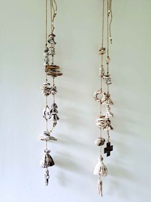 Handcrafted wall hanging with a distressed bronze colour wash.. A natural piece to hang indoors that will add interest to any wall, layers of hand shaped clay bells, discs & beads along with foraged shells & an aged iron cross, all hung on natural jute. The organic shapes & textures of each element creates a lovely & unique hanging art piece.
