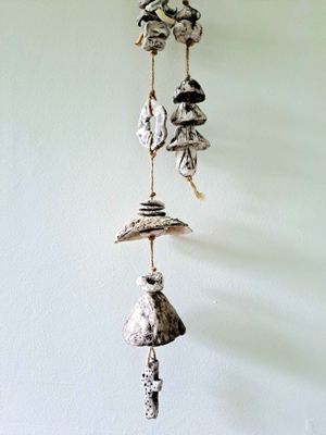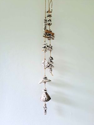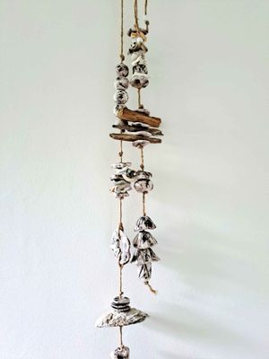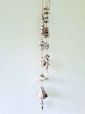 Handcrafted wall hanging with a distressed bronze/black colour wash. A natural piece to hang indoors that will add interest to any wall, layers of hand shaped clay bells, discs & beads along with foraged shells all hung on natural jute. The organic shapes & textures of each element creates a lovely & unique hanging art piece.