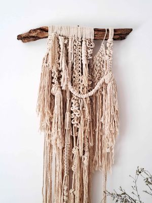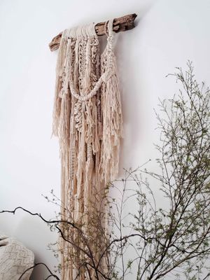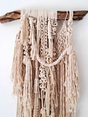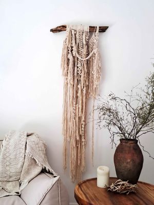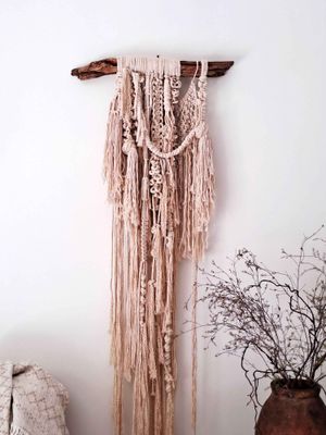 The raw natural fibres of cotton & linen have been woven, knotted, wrapped, stitched & knitted to make this unique soft sculpture wall hanging that oozes beautiful boho ethnic vibes & all layered onto a foraged hardwood branch, it's a gorgeous heavily detailed piece that will add natural charm & organic interest to any wall in your home.