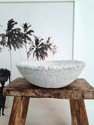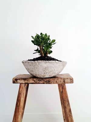 Orbit planter is a swoop rim chunky planter bowl, full of beautiful grainy texture from the black sand & crushed volcanic rock of it's construction. Hand pressed & raw edged with drain holes, Orbit looks great planted up with a stylish architectural plant for your table top.