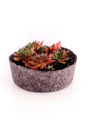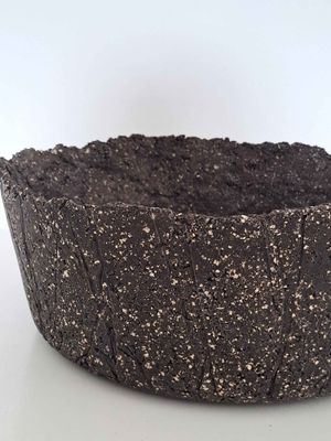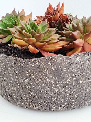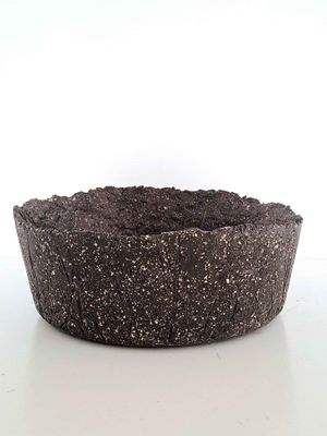 Aria planter is full of raw grainy texture from the beautiful black sand & crushed volcanic rock of it's construction. Hand pressed aggregate with a live edge & drain holes, plant it up with spring bulbs or stylish succulents for your table top.
